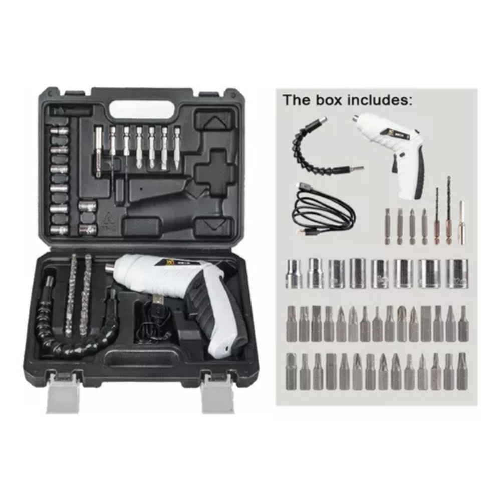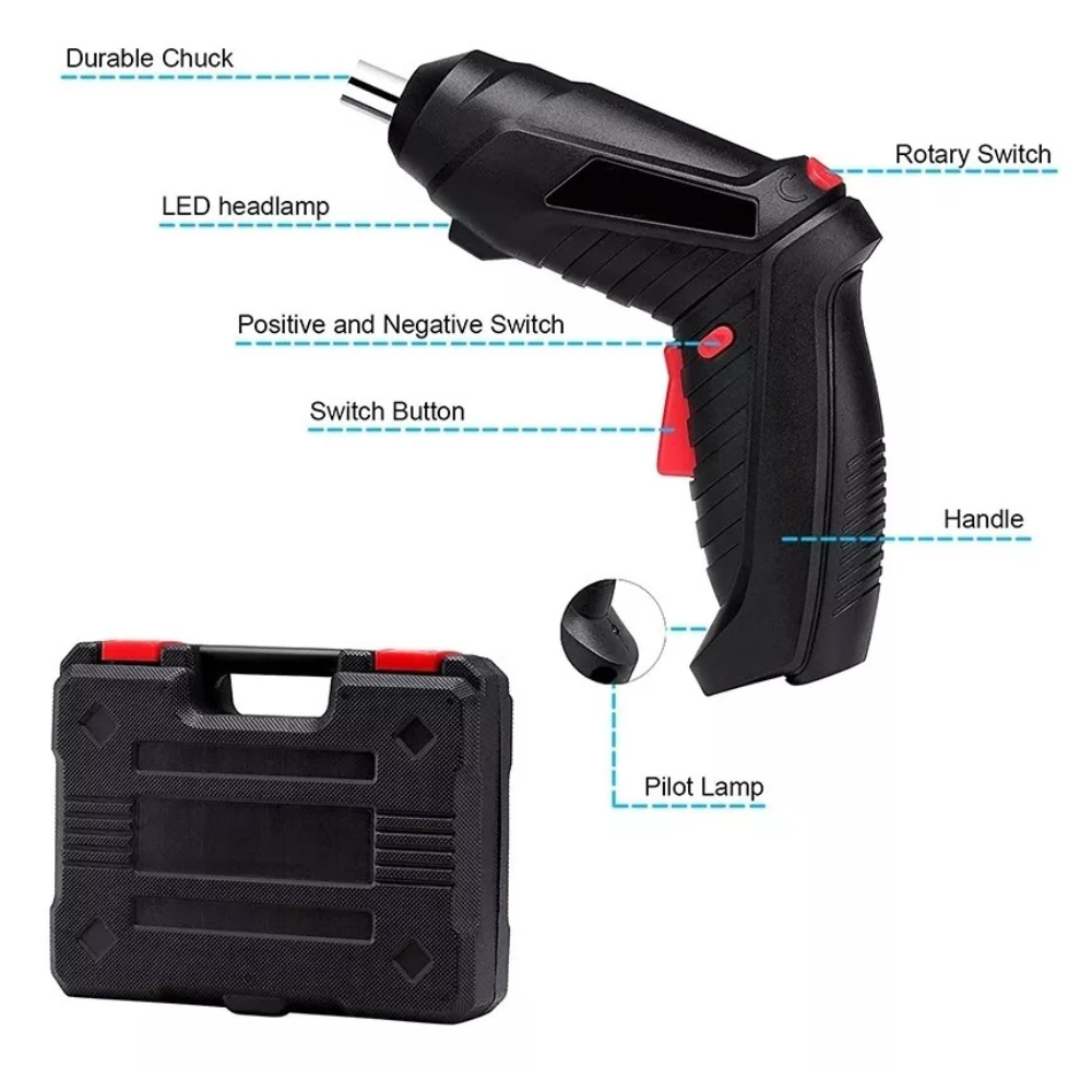Conveniente e inalámbrico No más cables enredados o movilidad limitada, con este destornillador eléctrico inalámbrico. Par potente Con un par máximo de 2 5 N m este destornillador eléctrico puede manejar proyectos de bricolaje difíciles con facilidad ,Batería recargable La batería de iones de litio de 3 6 V es recargable lo que le ahorra dinero en baterías desechables. Versátil Perfecto para una variedad de proyectos de bricolaje desde ensamblar muebles hasta arreglar productos electrónicos. Fácil de usar El diseño de la broca giratoria hace que sea fácil cambiar las brocas y hacer el trabajo rápidamente.